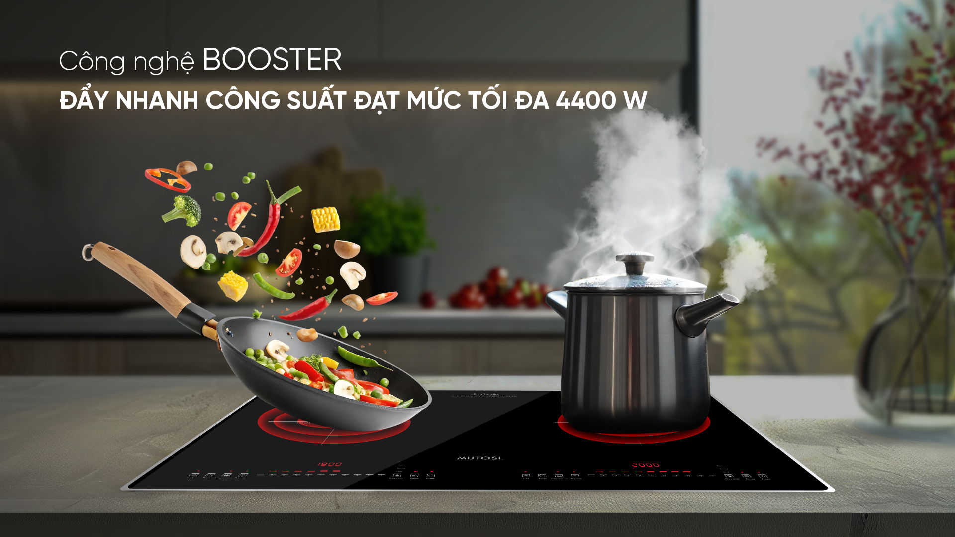 Bếp từ đôi Mutosi MI-66TL có công suất tối đa lên đến 4400W, đi kèm chế độ Booster tăng tốc tức thì, giúp món ăn chín nhanh hơn so với bếp thông thường. Bạn có thể thoải mái chế biến những món cần lửa lớn như xào, chiên, hay đơn giản là nấu nước sôi chỉ trong vài phút. Nhờ đó, bếp không chỉ tiết kiệm thời gian vào bếp mà còn mang lại trải nghiệm nấu nướng hiện đại, tiện lợi cho cả gia đình.