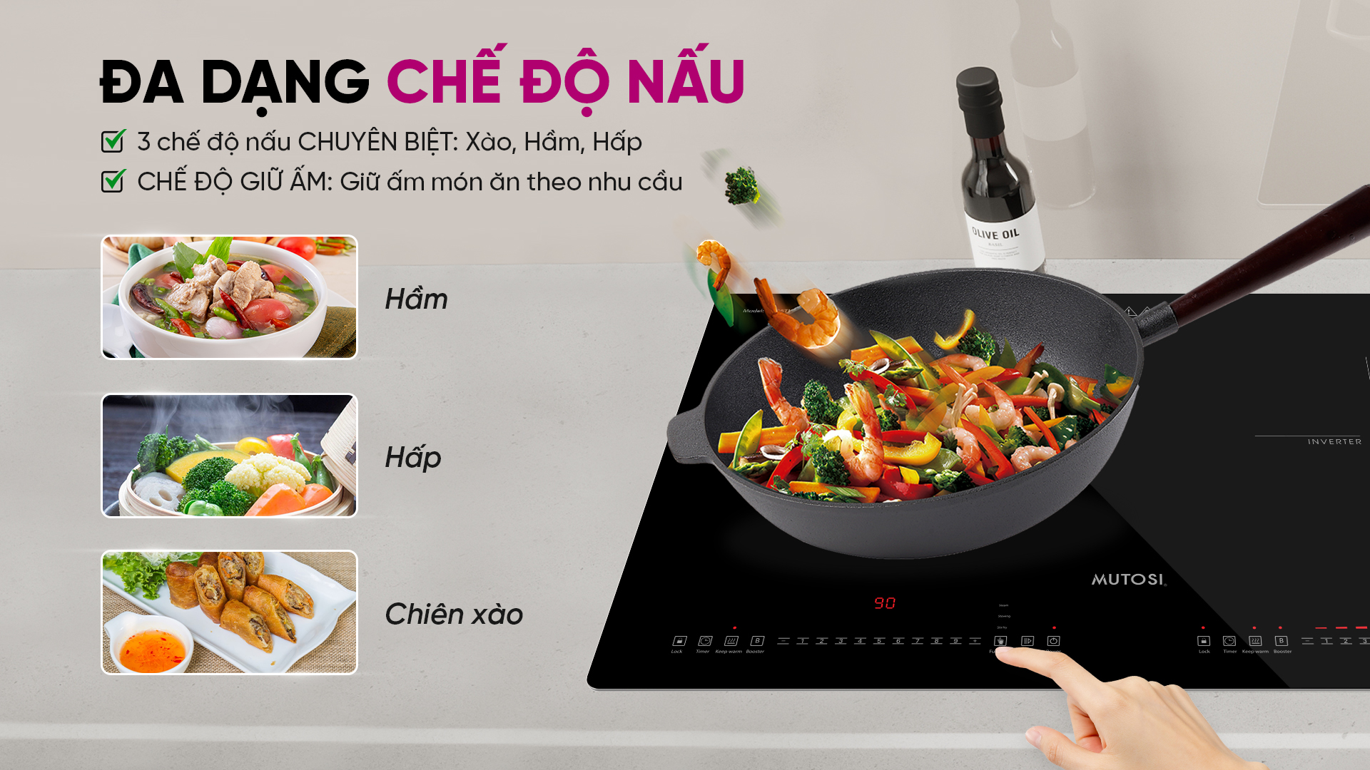 Bếp từ Mutosi cung cấp sẵn 3 chế độ nấu tiện lợi cùng chế độ giữ ấm với từng mức nhiệt hợp lý, dễ dàng đáp ứng nhu cầu nấu nướng đa dạng của mọi nhà: