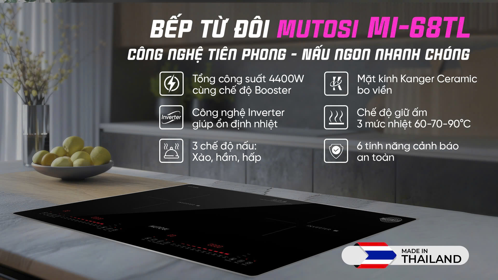 Bếp từ đôi MI-68TL Mutosi sở hữu công nghệ Inverter đảm bảo gia nhiệt ổn định ngay cả ở mức công suất thấp nhất. Điều này cực kỳ lý tưởng cho những món ăn cần nấu liu riu, hầm nhừ mà không lo bị tắt bếp hay gián đoạn nhiệt độ, giúp món ăn luôn chín đều và giữ trọn hương vị.