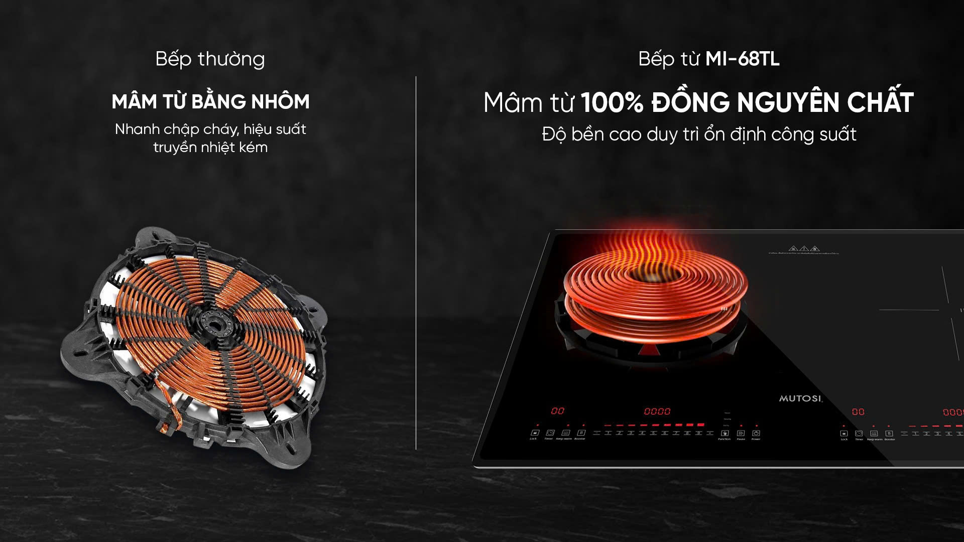 Bếp từ đôi Mutosi MI-68TL được trang bị mâm từ làm hoàn toàn bằng đồng nguyên chất, giúp truyền nhiệt nhanh, ổn định và tiết kiệm điện năng. Không chỉ nâng cao hiệu suất nấu nướng, mâm từ đồng còn có tuổi thọ vượt trội, hạn chế hỏng hóc, đảm bảo bếp hoạt động bền bỉ theo thời gian.