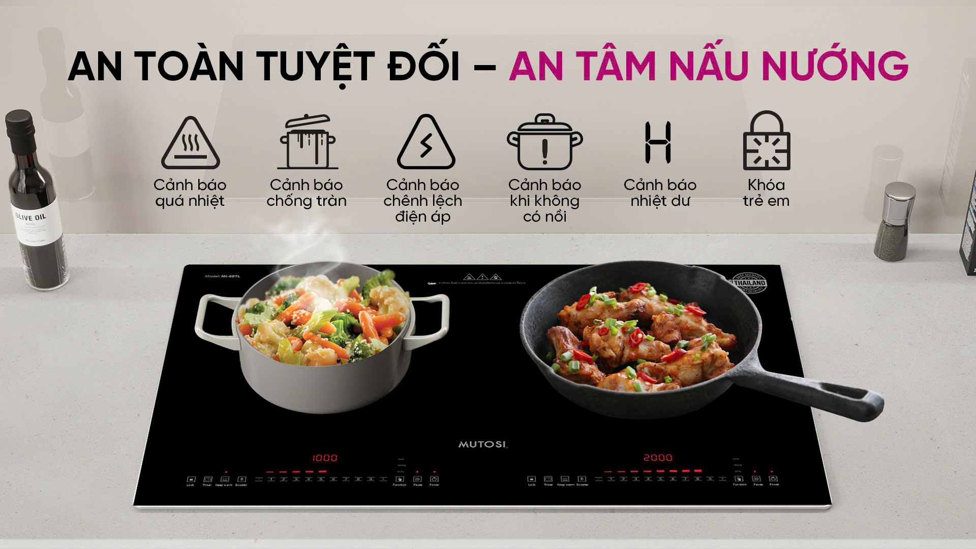 Với bếp từ đôi Mutosi MI-68TL, bạn hoàn toàn có thể yên tâm nấu nướng nhờ hệ thống tính năng an toàn toàn diện: Cảnh báo quá nhiệt, Cảnh báo chống tràn, Cảnh báo chênh lệch điện áp, Cảnh báo nhiệt dư, Cảnh báo khi không có nồi, Khóa trẻ em. Mỗi tính năng đều được thiết kế để bảo vệ tối đa cho người sử dụng, đặc biệt là gia đình có trẻ nhỏ, giúp bạn an tâm tận hưởng từng bữa ăn mà không phải lo lắng sự cố trong quá trình nấu nướng.