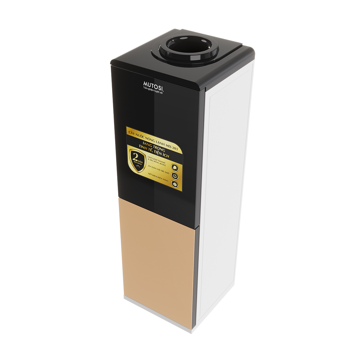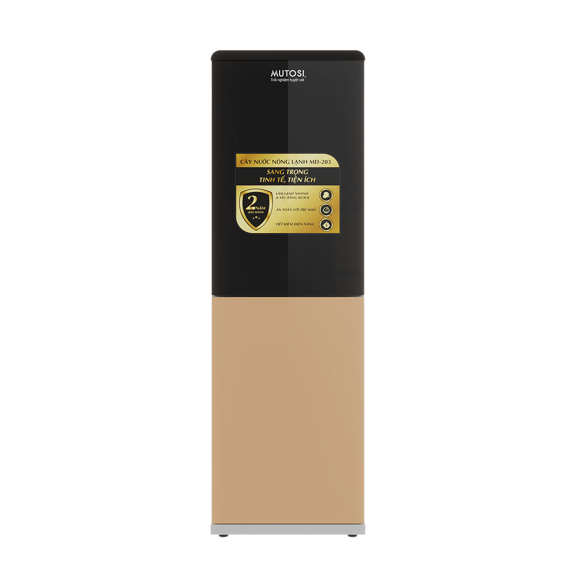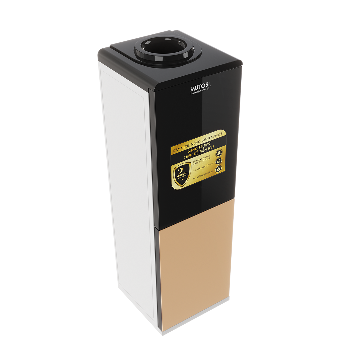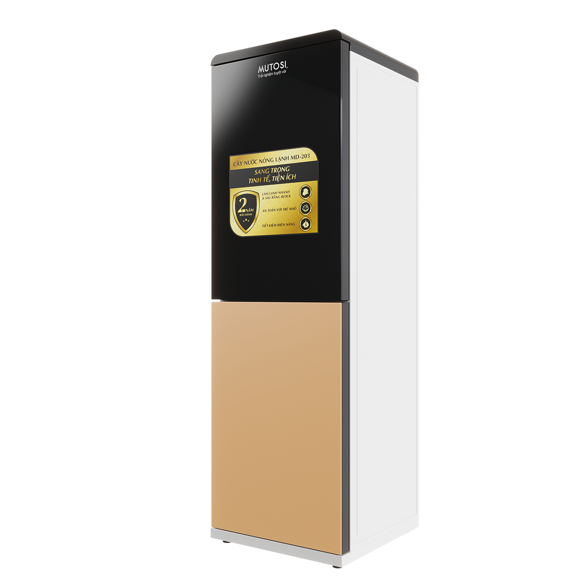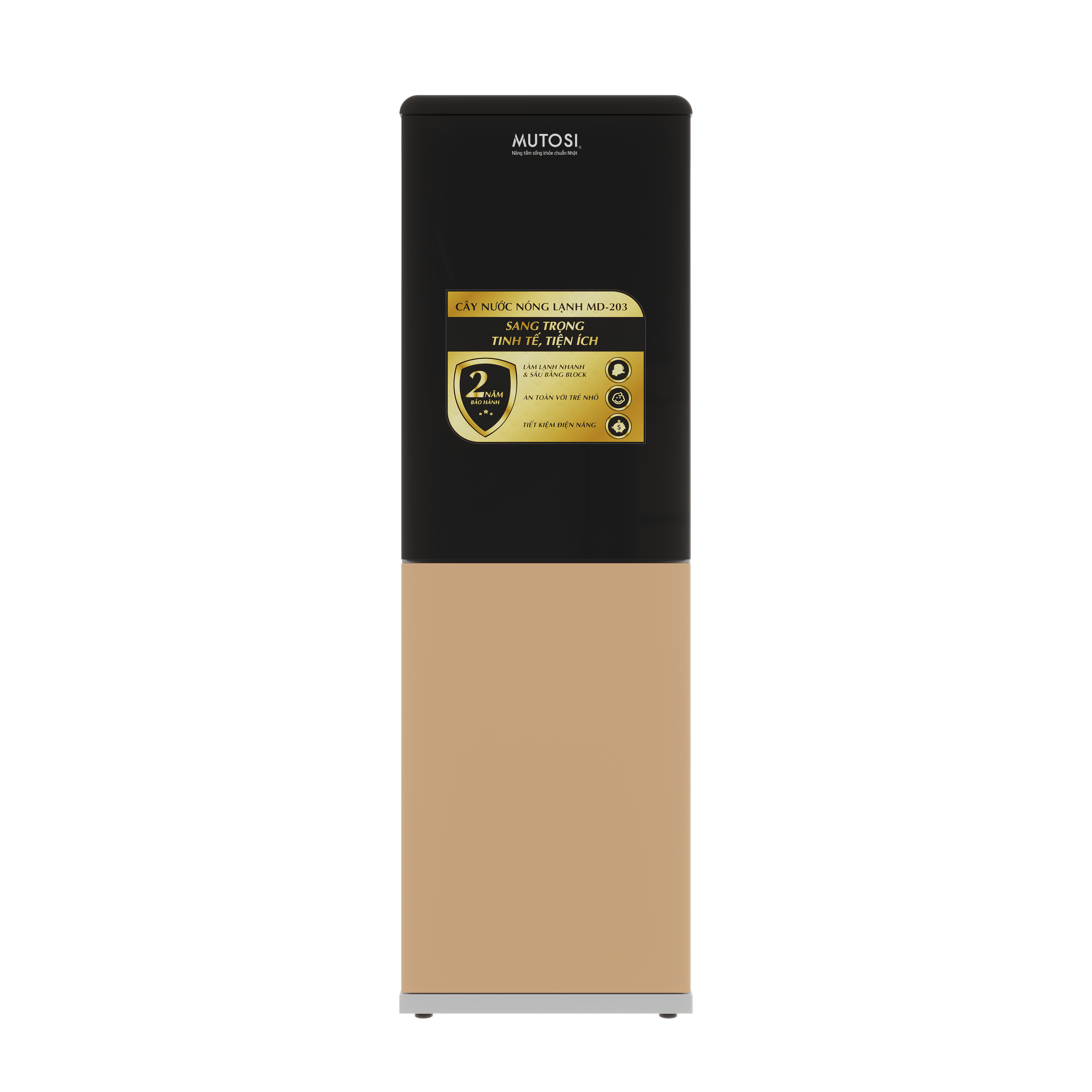 Cây nóng lạnh Mutosi MD-203 có màu đen kết hợp vàng đồng, tạo ấn tượng sang trọng hiện đại cho bất kì không gian văn phòng – gia đình.