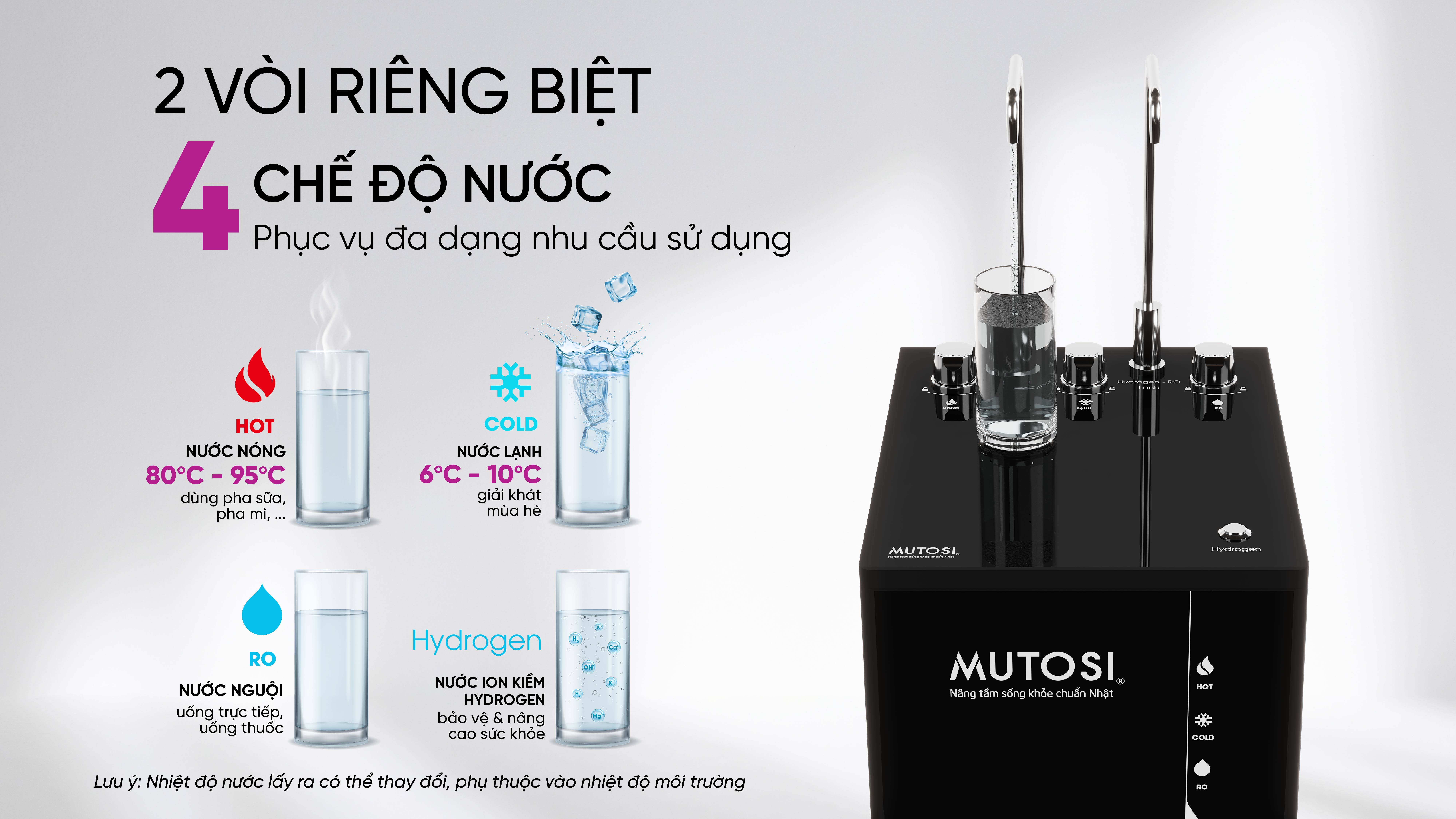 Máy lọc nước iON Kiềm Hydrogen MP-S1021H của Mutosi có thiết kế tách biệt 2 đường nước tinh khiết và nước ion kiềm hydrogen, người dùng sử dụng tùy chọn theo nhu cầu: nước tinh khiết dùng nấu ăn, pha sữa, nước uống cho trẻ nhỏ; nước ion kiềm Hydrogen dùng cho người có nhu cầu hỗ trợ chăm sóc sức khỏe.