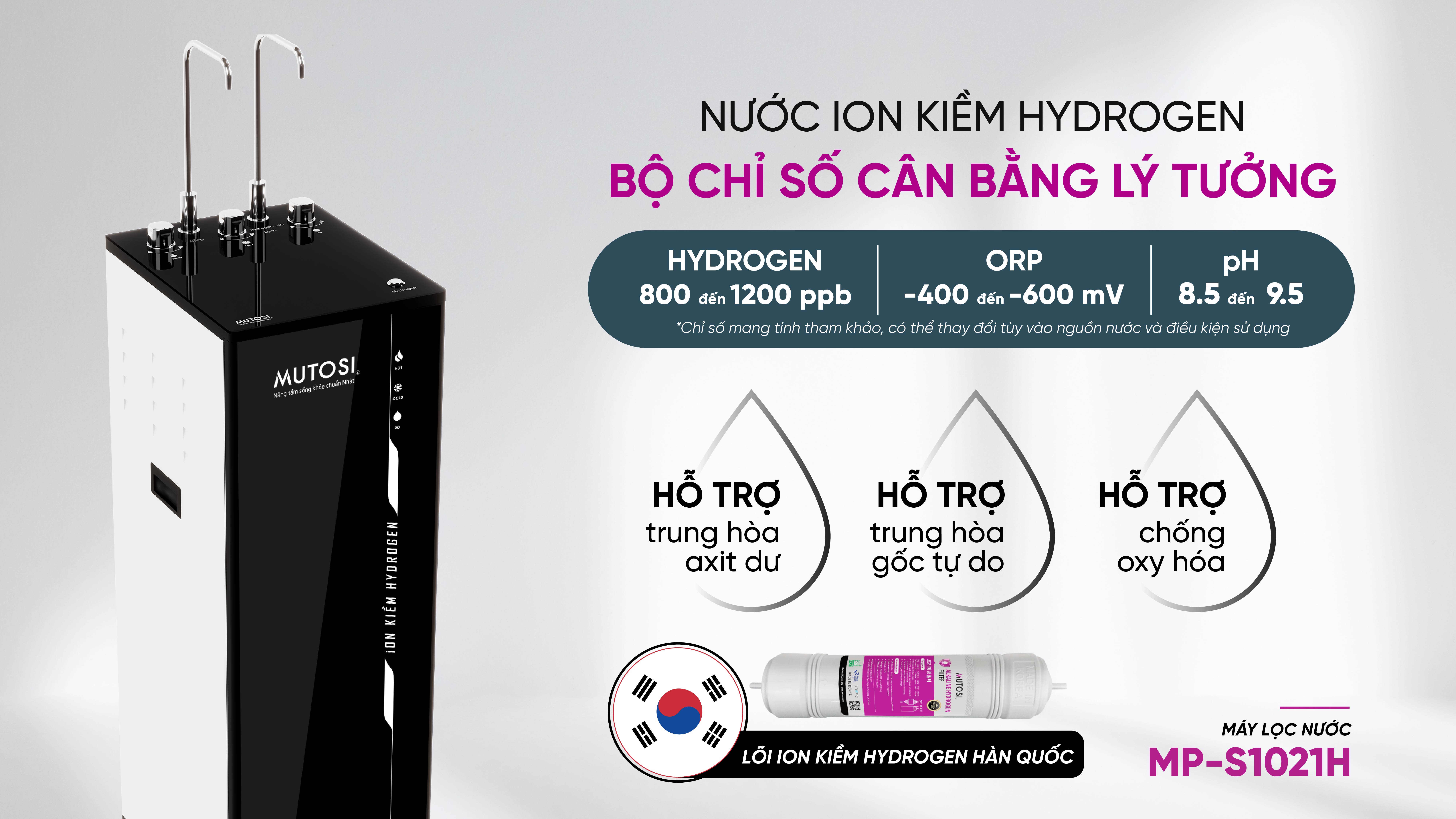 Với lõi ion kiềm hydrogen nhập khẩu Hàn Quốc, nước ion kiềm hydrogen tạo ra từ MP-S1021H có chỉ số cân bằng lý tưởng trong thời gian dài. Người dùng hoàn toàn có thể an tâm về chất lượng nước sau lọc với mức pH ổn định 8.5-9.5, hàm lượng hydrogen 800- 1200ppb, chỉ số ORP âm sâu -400 đến -600mV.