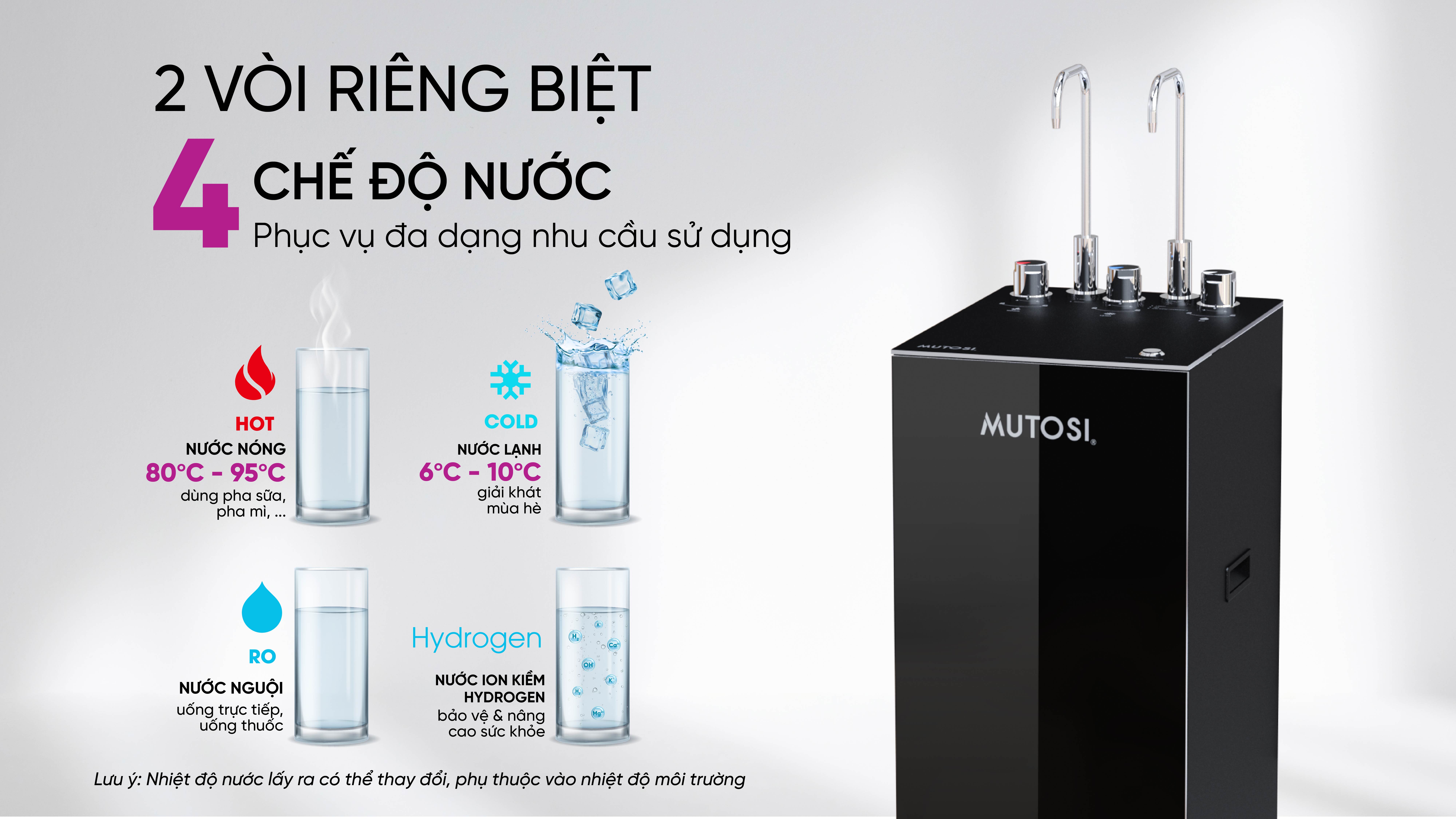 Máy lọc nước iON Kiềm Hydrogen MP-S129H của Mutosi có thiết kế tách biệt 2 đường nước tinh khiết và nước ion kiềm hydrogen, người dùng sử dụng tùy chọn theo nhu cầu: nước tinh khiết dùng nấu ăn, pha sữa, nước uống cho trẻ nhỏ; nước ion kiềm Hydrogen dùng cho người có nhu cầu hỗ trợ chăm sóc sức khỏe.