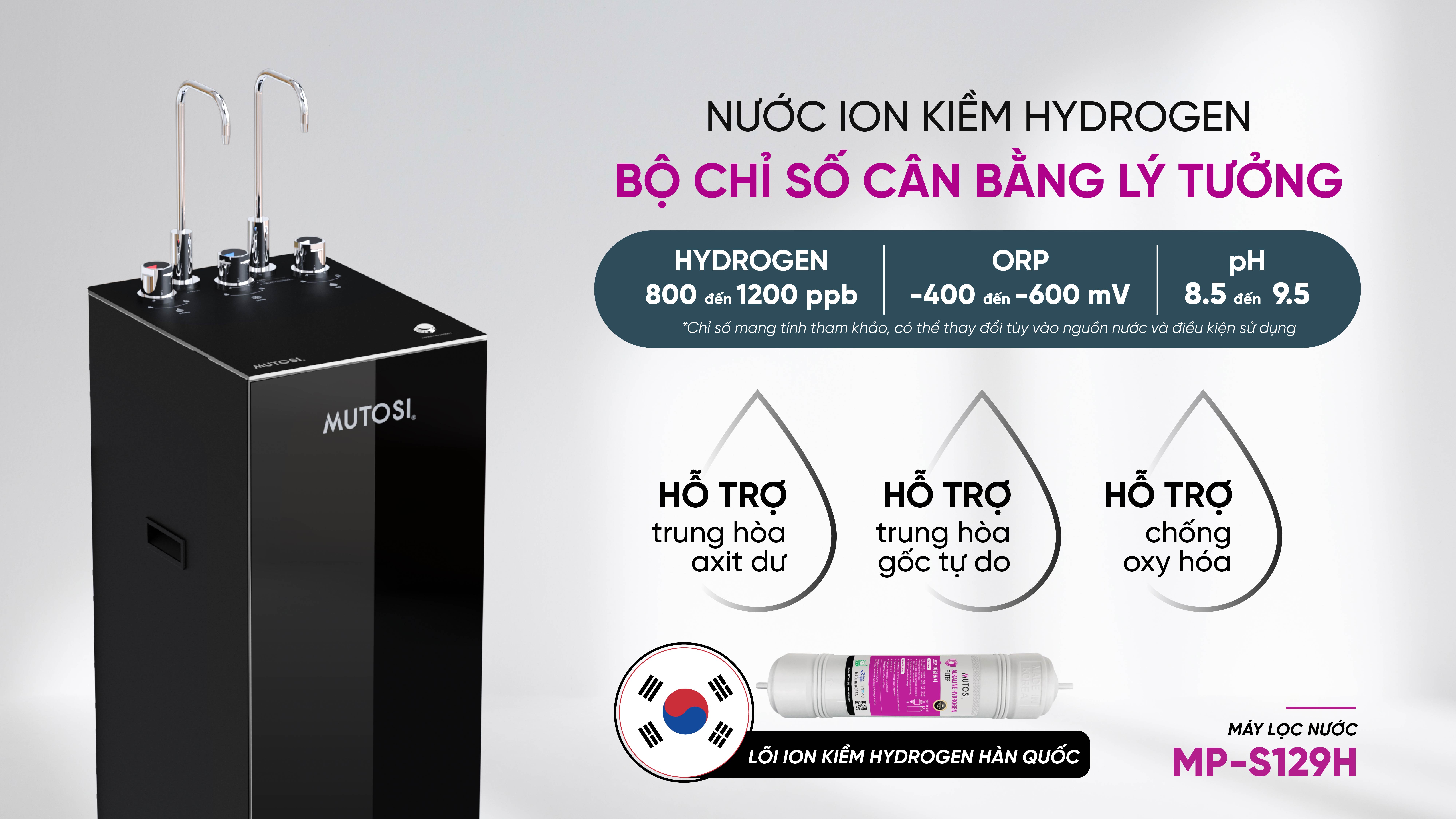 Với lõi ion kiềm hydrogen nhập khẩu Hàn Quốc, nước ion kiềm hydrogen tạo ra từ MP-S129H có chỉ số cân bằng lý tưởng trong thời gian dài. Người dùng hoàn toàn có thể an tâm về chất lượng nước sau lọc với mức pH ổn định 8.5-9.5, hàm lượng hydrogen 800- 1200ppb, chỉ số ORP âm sâu -400 đến -600mV.