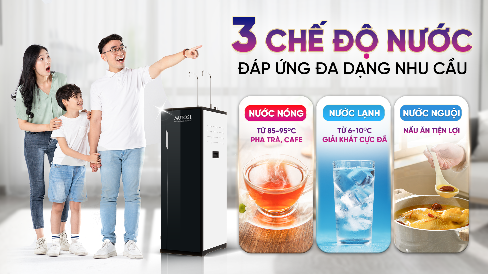 2 vòi, 3 chế độ nước nóng - lạnh - nguội thuận tiện