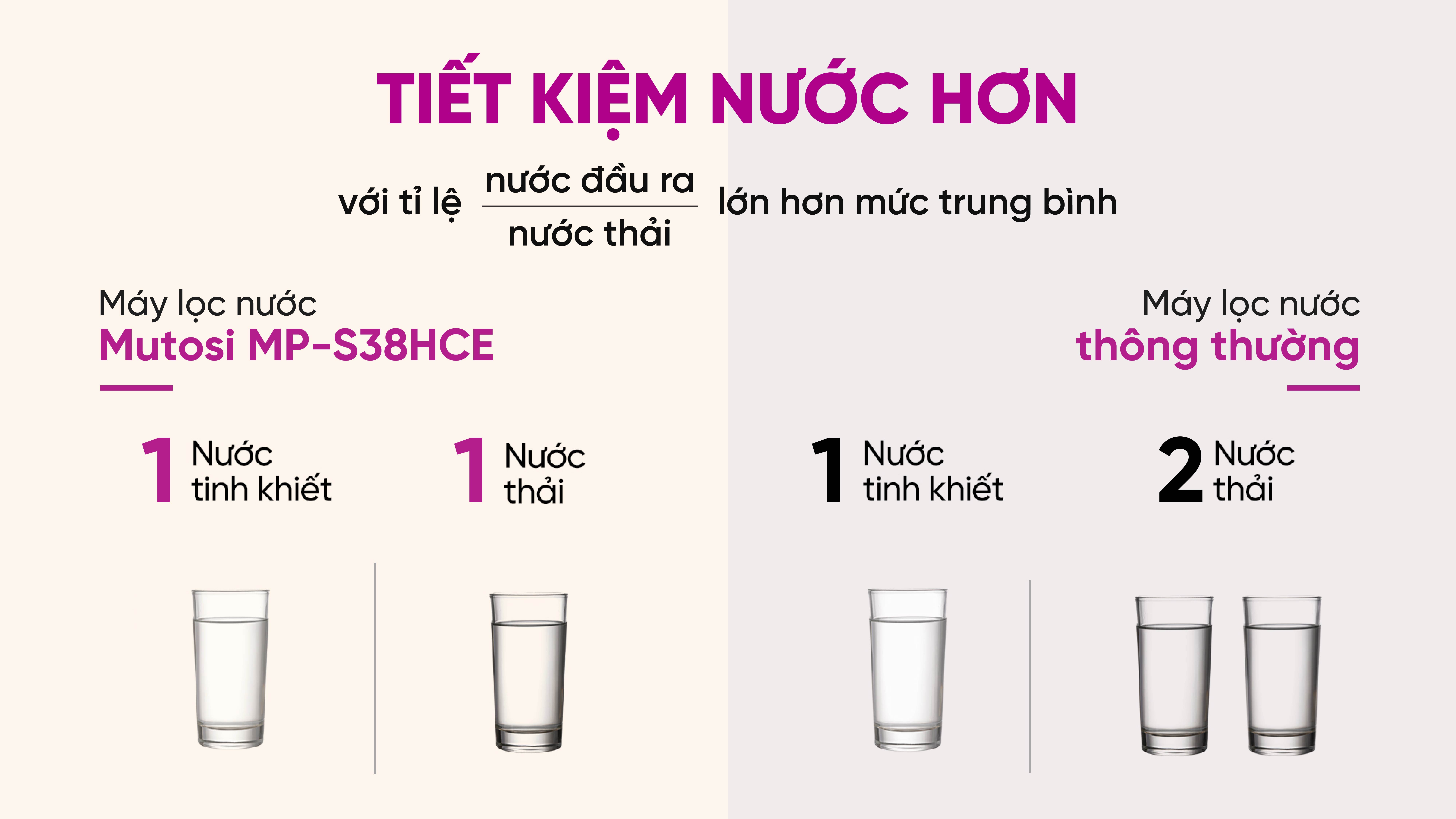 Với tỷ lệ thu hồi nước tinh khiết lên đến 50:50, MP-S38HCE giúp tiết kiệm nước một cách đáng kể so với các màng lọc thông thường chỉ có tỷ lệ thu hồi 30:70. Như vậy, để có được 2 cốc nước tinh khiết sau lọc, MP-S38HCE chỉ mất 2 cốc nước thải thay vì 3 cốc nước thải như những dòng máy lọc nước thông thường khác