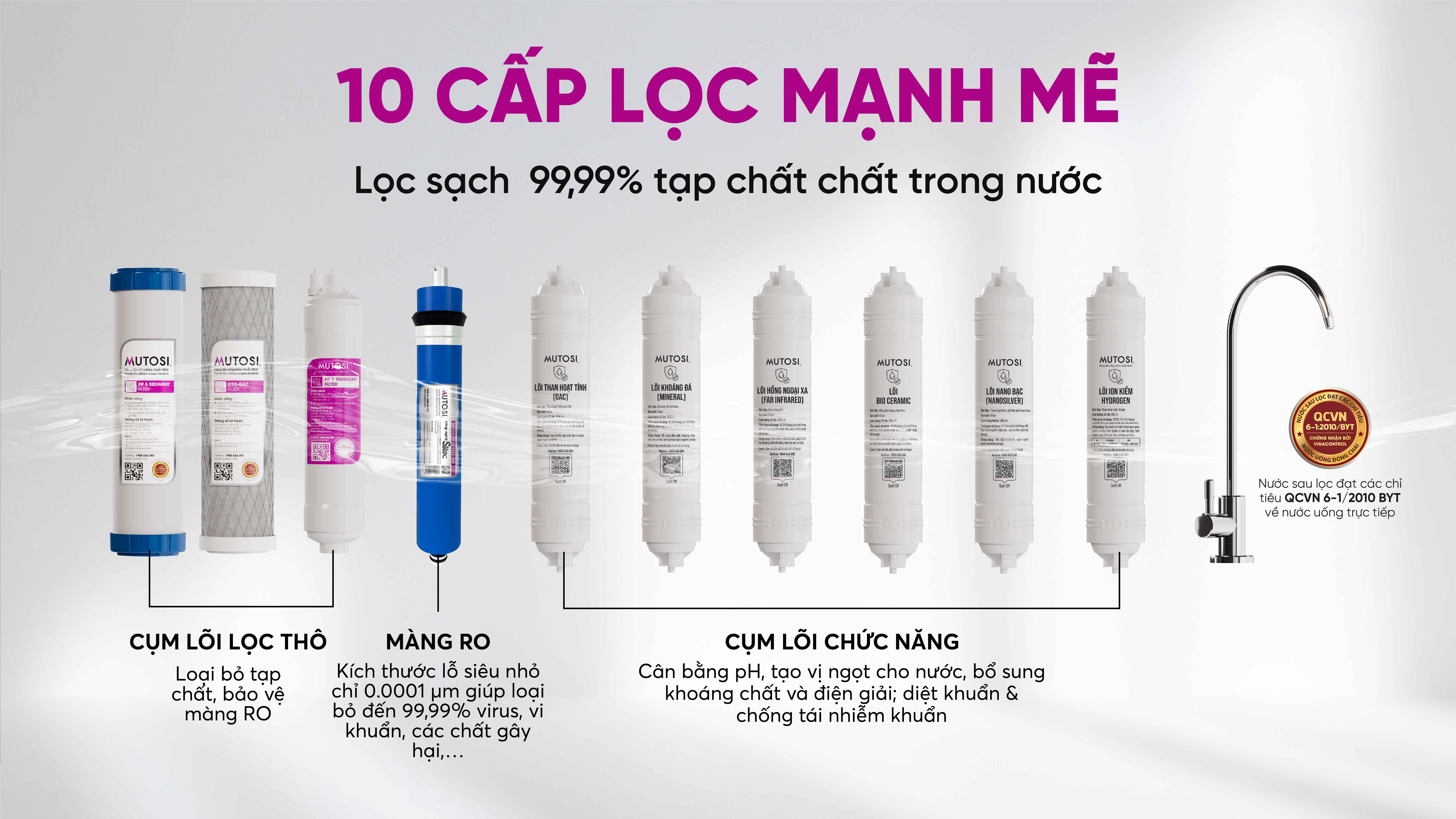 Màng RO Mutosi giúp loại bỏ 99,99% virus, vi khuẩn, các chất độc hại trong nước như chì, thủy ngân, asen,..., cho nguồn nước sau lọc chuẩn tinh khiết.