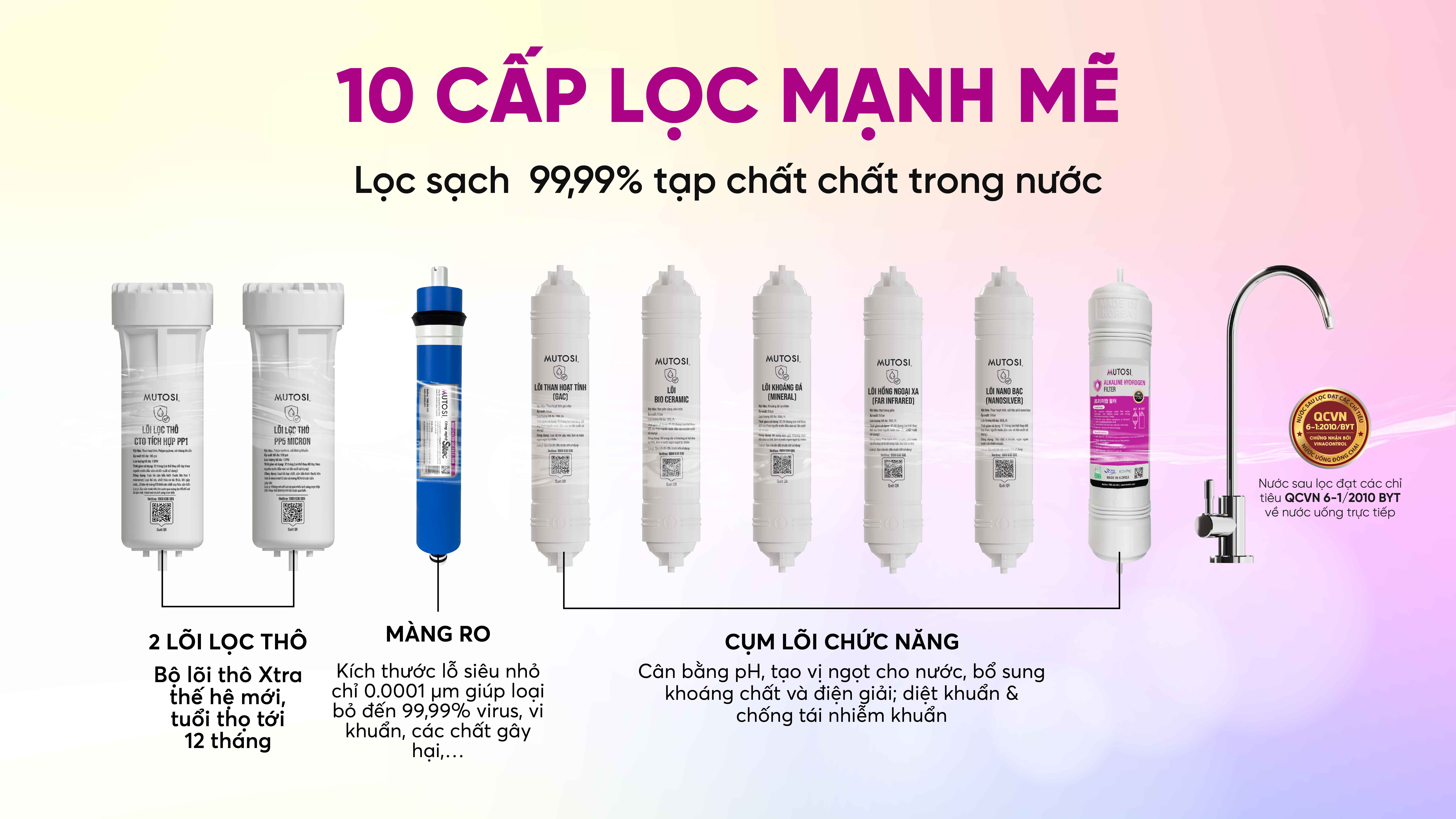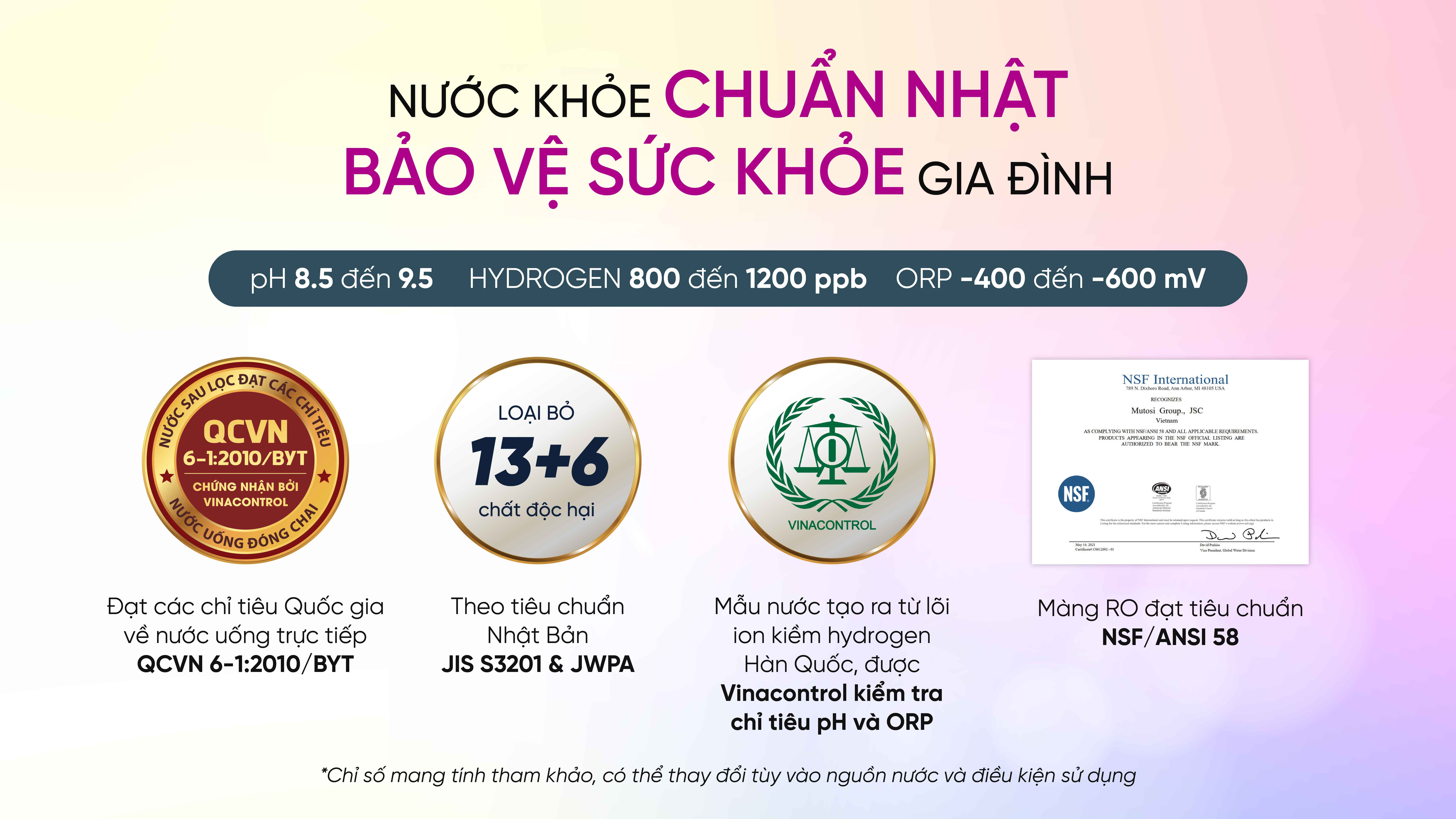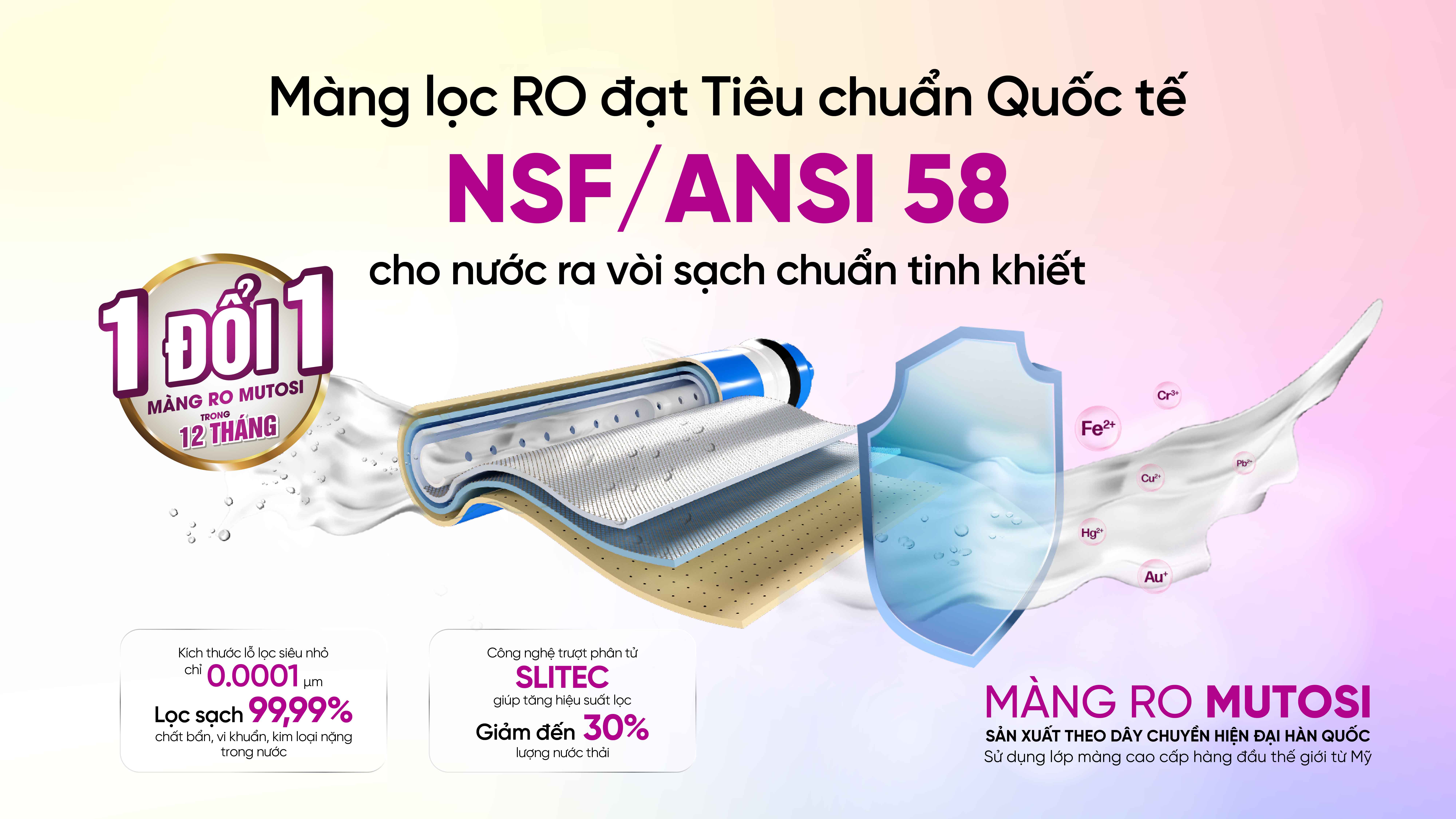 Màng RO Mutosi đạt tiêu chuẩn NSF/ANSI 58: Loại bỏ 99,99% virus, vi khuẩn, các chất độc hại trong nước như chì, thủy ngân, asen,..., cho nguồn nước sau lọc chuẩn tinh khiết.
