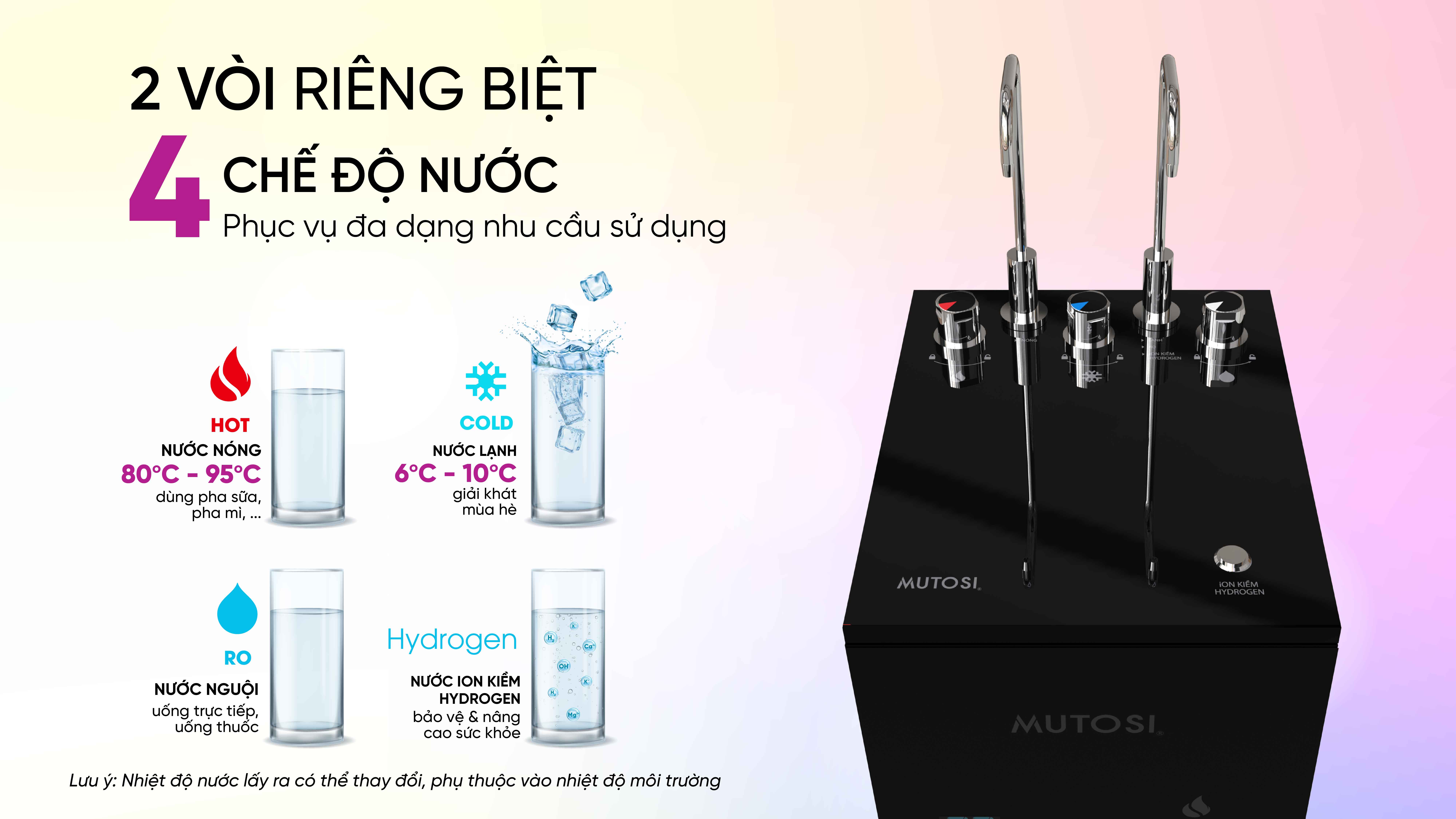 Máy lọc nước iON Kiềm Hydrogen MP-TS1026H của Mutosi có thiết kế tách biệt 2 đường nước tinh khiết và nước ion kiềm hydrogen, người dùng sử dụng tùy chọn theo nhu cầu: nước tinh khiết dùng nấu ăn, pha sữa, nước uống cho trẻ nhỏ; nước ion kiềm Hydrogen dùng cho người có nhu cầu hỗ trợ chăm sóc sức khỏe.