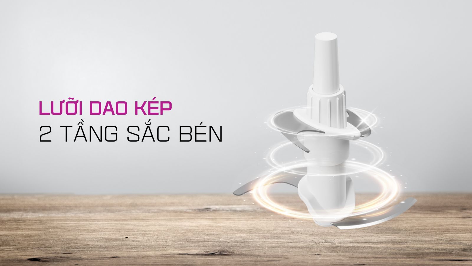 Lưỡi dao chữ S chất liệu inox cao cấp, cùng công suất khỏe 350W tạo lực cắt mạnh và sắc bén, cho phép xay nhanh cả thực phẩm khó nghiền chỉ trong thời gian ngắn. Ngoài ra, lưỡi dao được thiết kế 2 tầng kép khác biệt, giúp luân chuyển thực phẩm đều trong lòng cối và xay nhuyễn thực phẩm. Đặc biệt, lưỡi dao có thể tháo rời giúp dễ dàng vệ sinh.