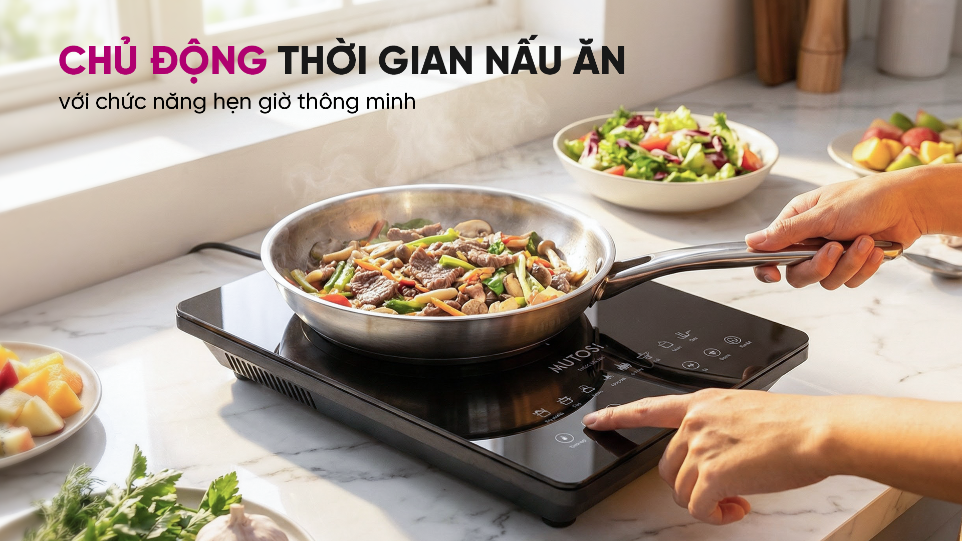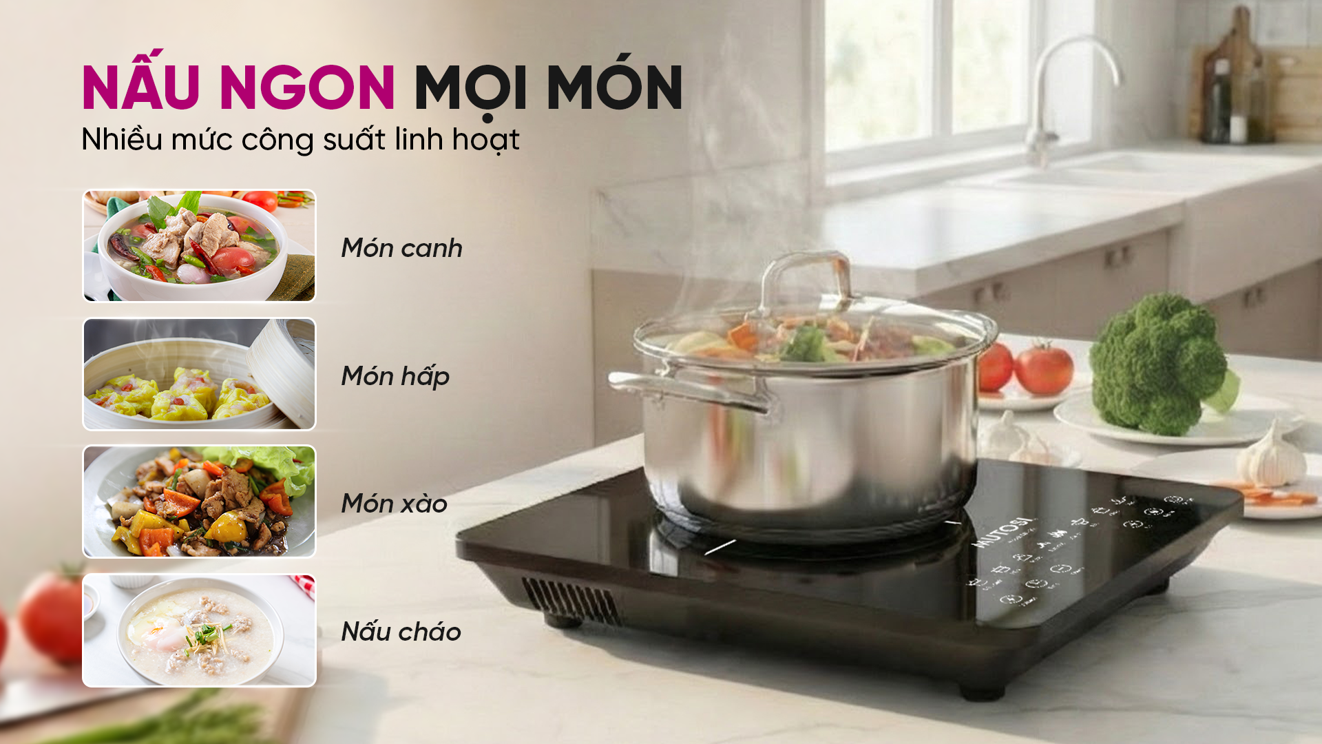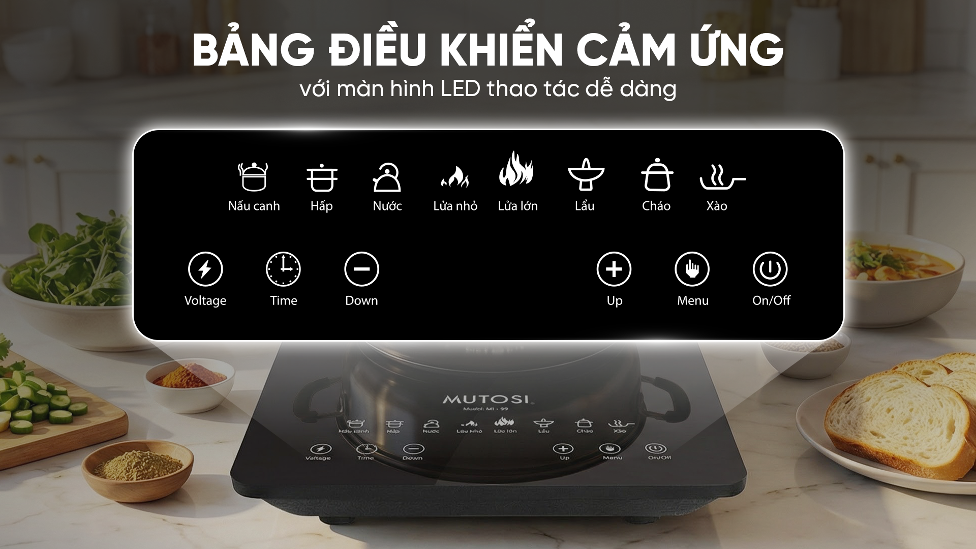 Bếp từ đơn Mutosi MI-99 gồm nhiều chế độ nấu nướng được tích hợp ngay trên mặt điều khiển, bao gồm: lẩu, hấp, hầm, nấu canh, chiên/rán,... giúp người dùng dễ dàng chế biến được nhiều món ăn khác nhau với các thao tác đơn giản.