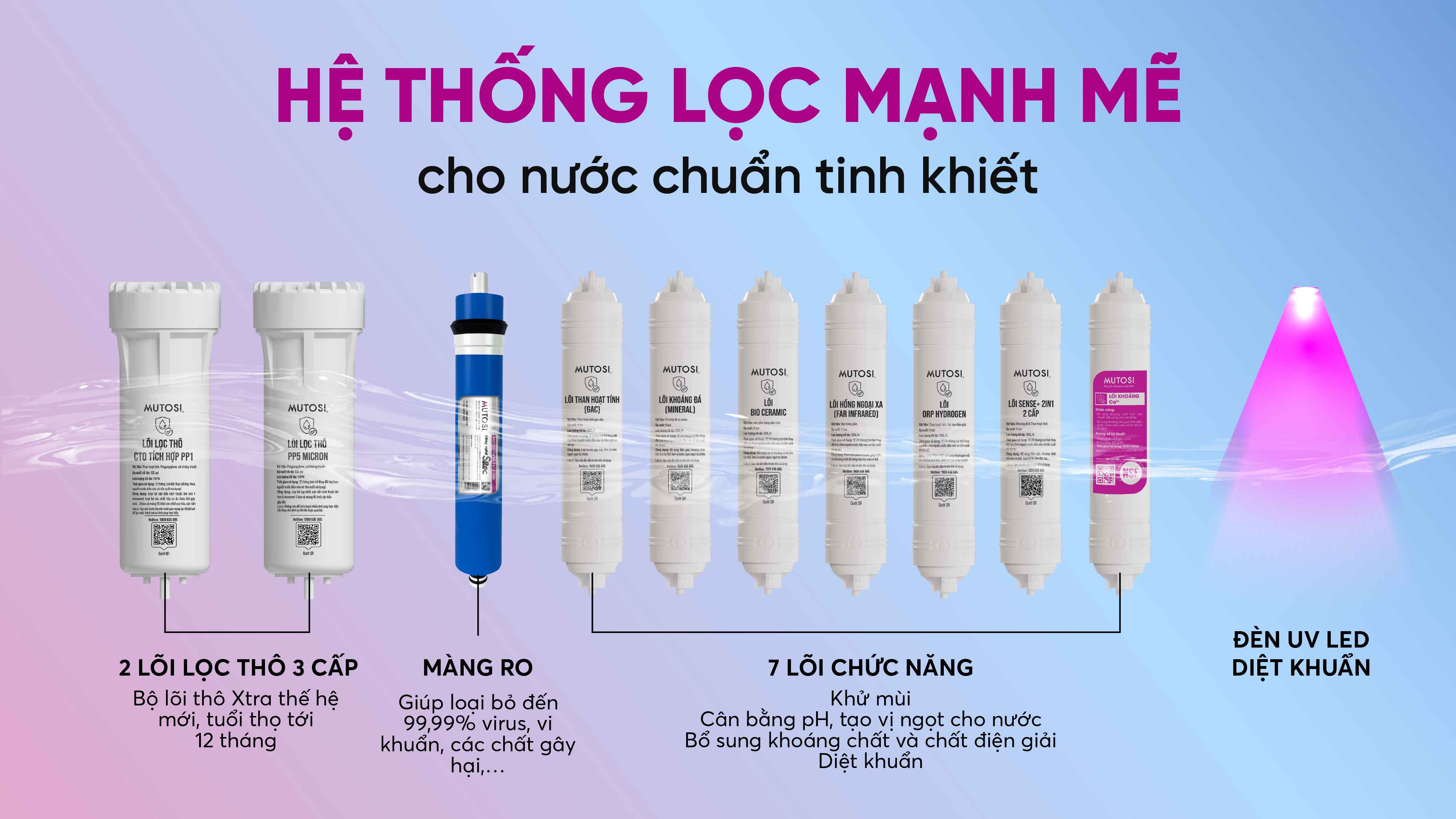 Màng RO Mutosi giúp loại bỏ 99,99% virus, vi khuẩn, các chất độc hại trong nước như chì, thủy ngân, asen,..., cho nguồn nước sau lọc chuẩn tinh khiết