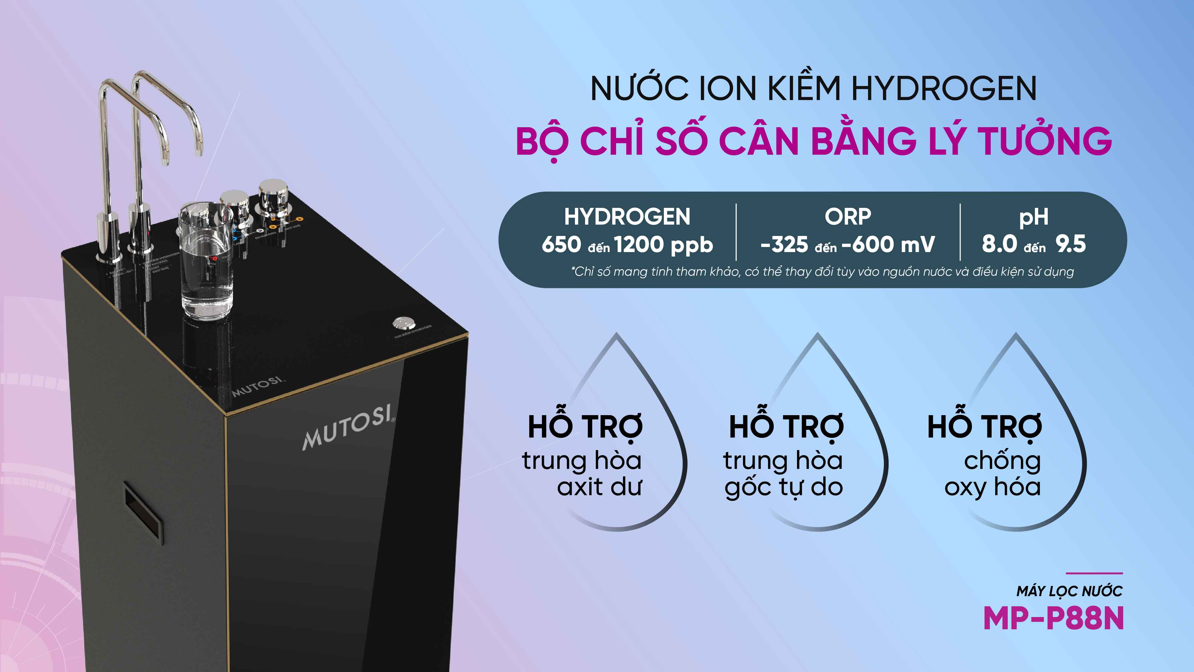 pH 8-9.5, Hydrogen 650-1200 ppb, ORP - 325 đến -600mV. Chỉ số nước axit nhẹ pH 5.5 đến 6.5