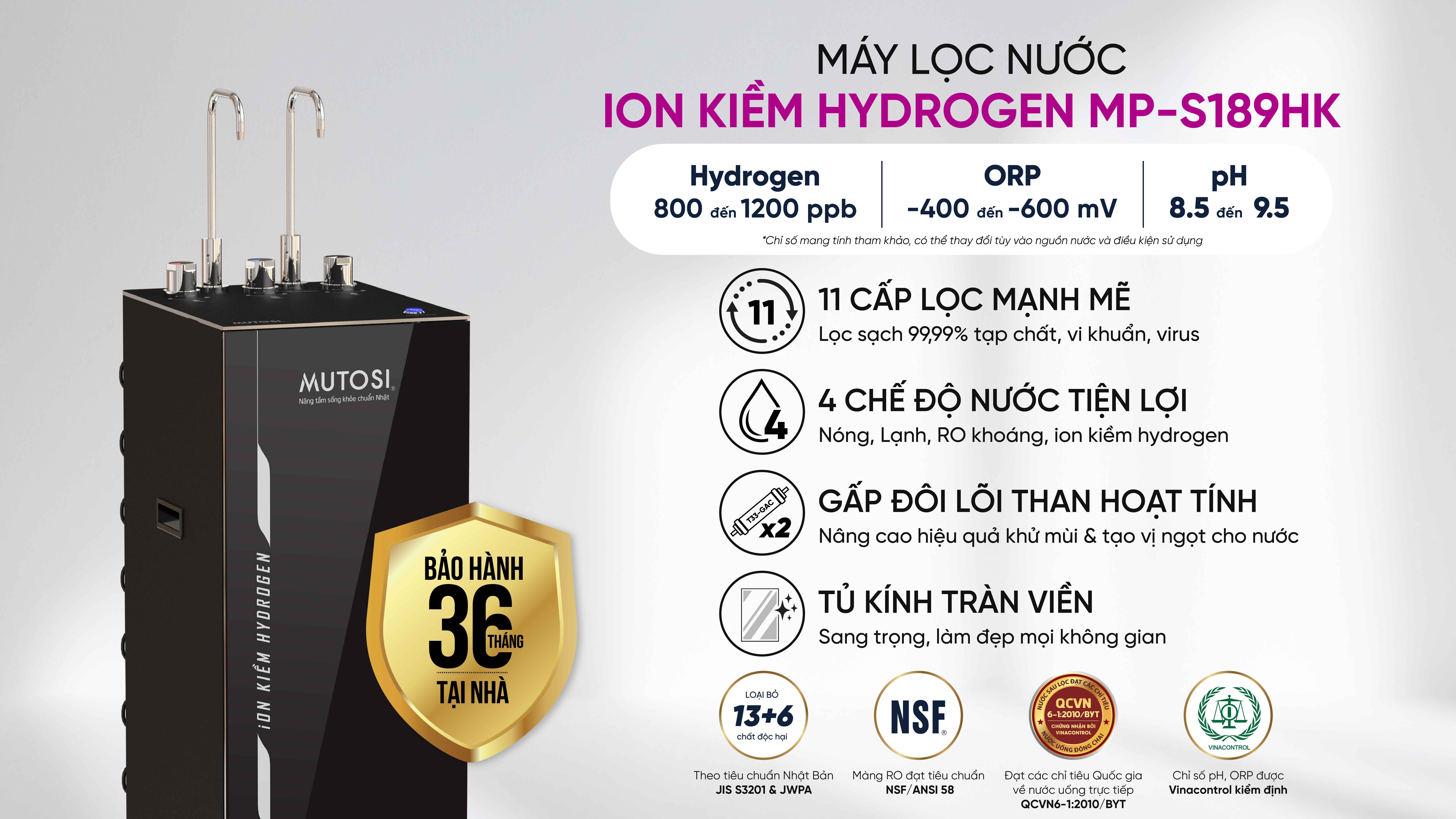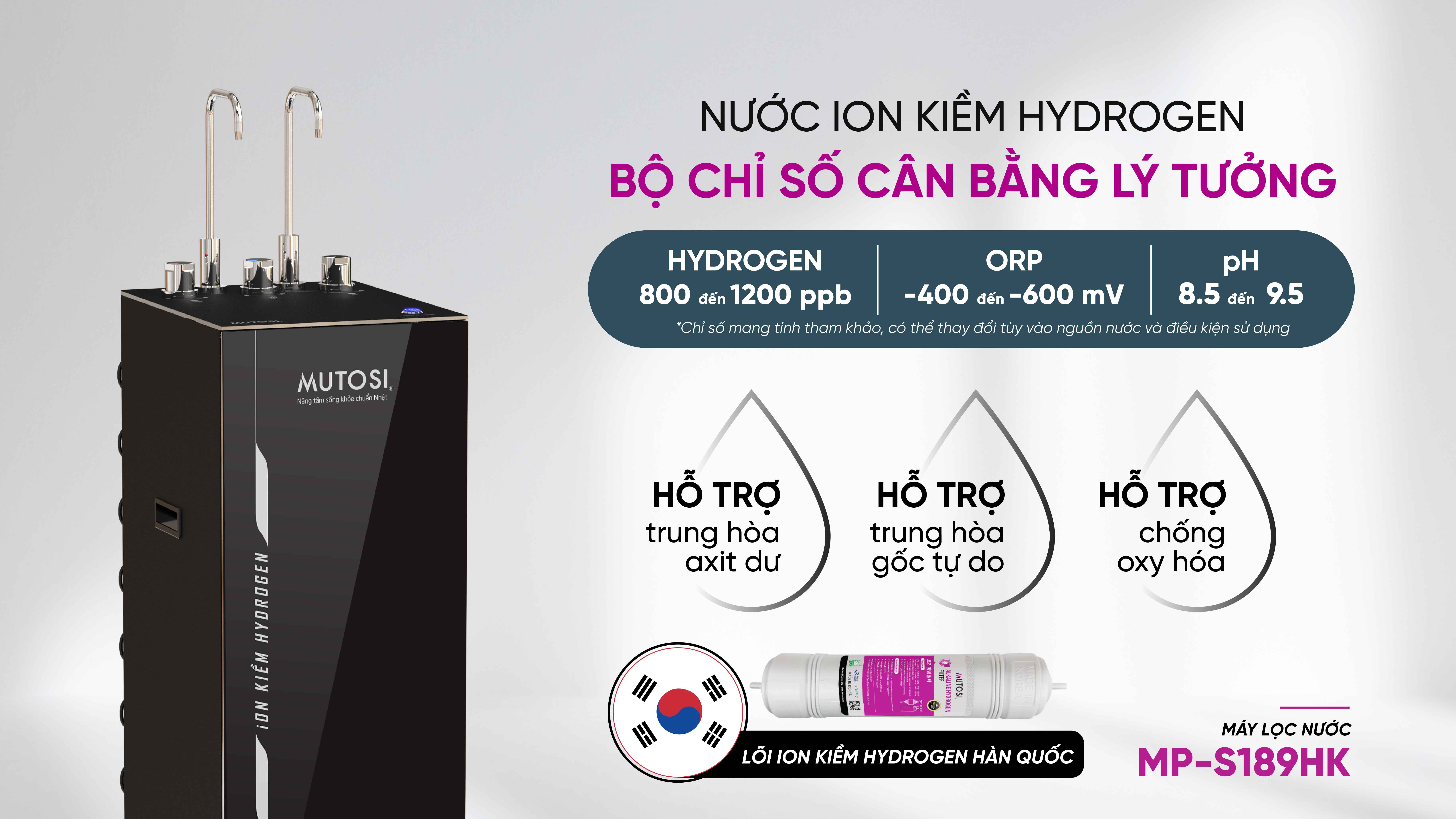 Với lõi ion kiềm hydrogen, nước ion kiềm hydrogen tạo ra từ MP-S189HK có chỉ số cân bằng lý tưởng. Người dùng hoàn toàn có thể an tâm về chất lượng nước sau lọc với mức pH ổn định 8.0-9.0, hàm lượng hydrogen 900- 1600ppb, chỉ số ORP âm sâu -450 đến -800mV.