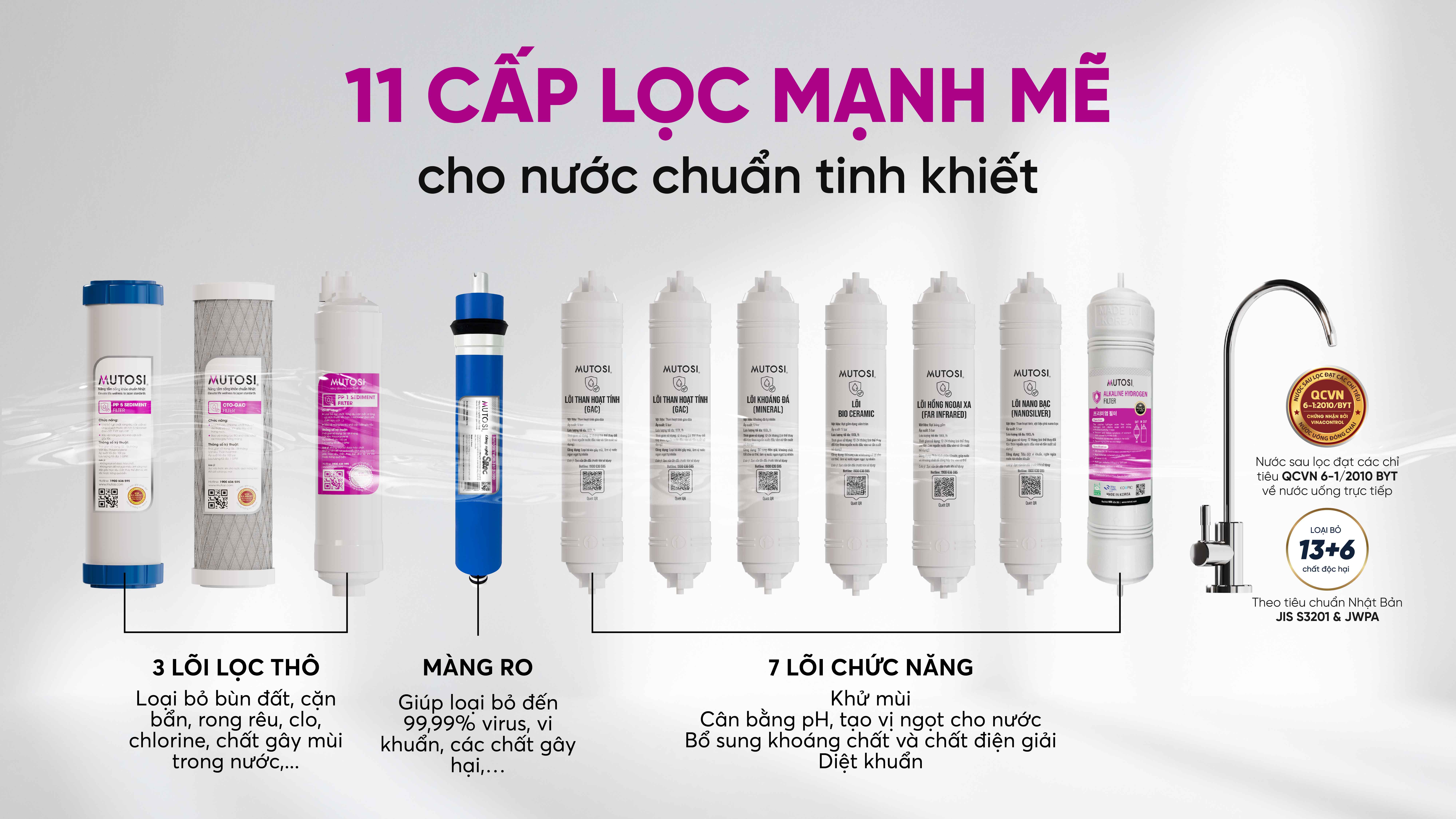 Với 7 lõi chức năng gấp đôi lõi than hoạt tính T33-GAC, máy lọc nước MP-S189HK cung cấp các khoáng chất cần thiết cho cơ thể và diệt khuẩn một cách hiệu quả: