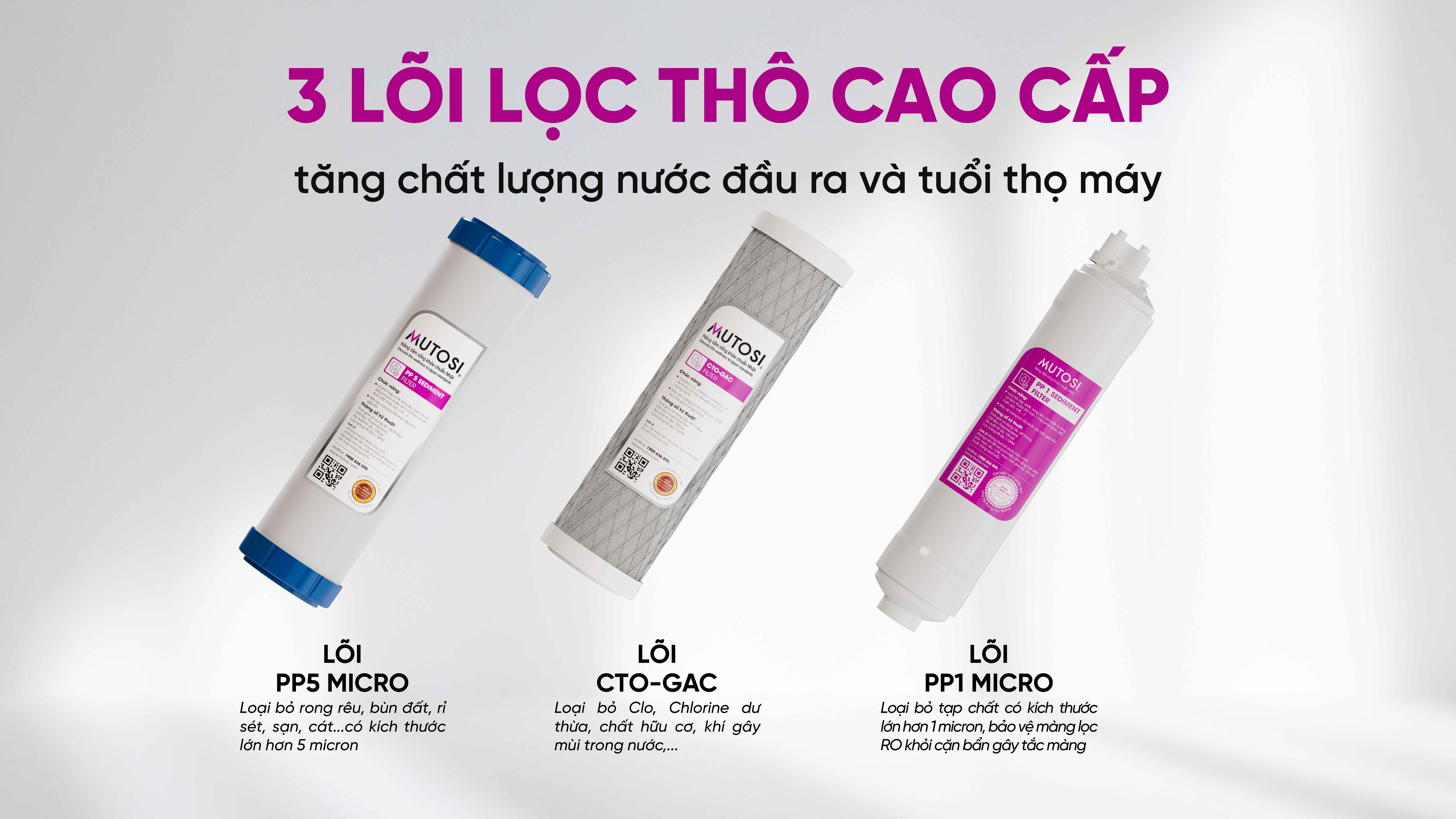 Máy lọc nước MP-S189HK được trang bị ba loại lõi lọc thô, góp phần vào quá trình bảo vệ độ bền của hệ thống lọc và tạo ra nguồn nước chuẩn tinh khiết sau lọc.